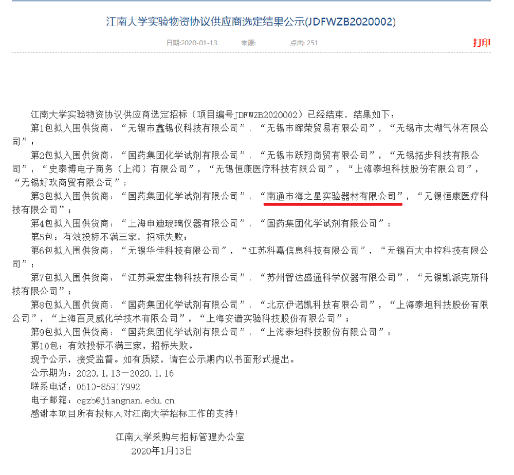 江南大學(xué)實驗物資協(xié)議供應(yīng)商選定結(jié)果公示(JDFWZB2020002)